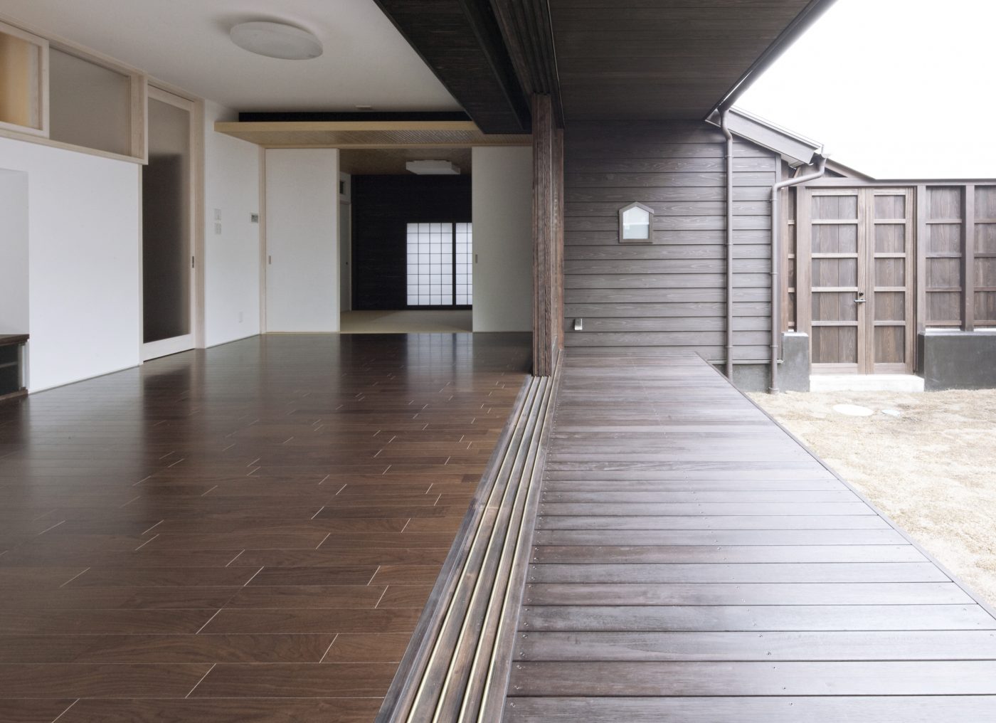 長庇の下、庭と室内をつなぐウリンの広縁。 奥行1.8m、長さ10mの半屋外空間。 そこに腰掛け家族と語らう。大の字になって寝そべる。