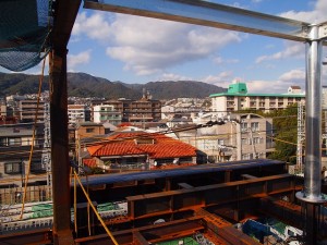 屋上から。奥の山並みは六甲山 。